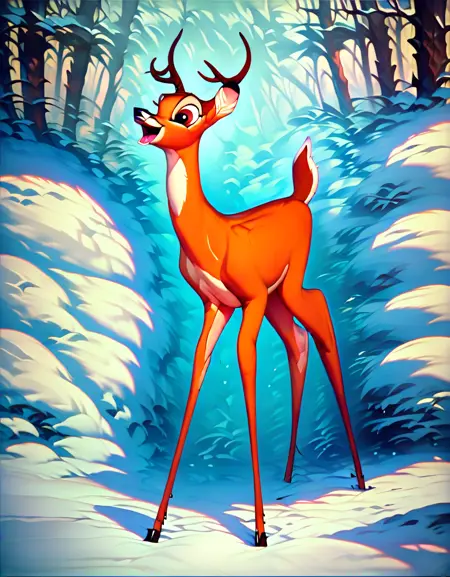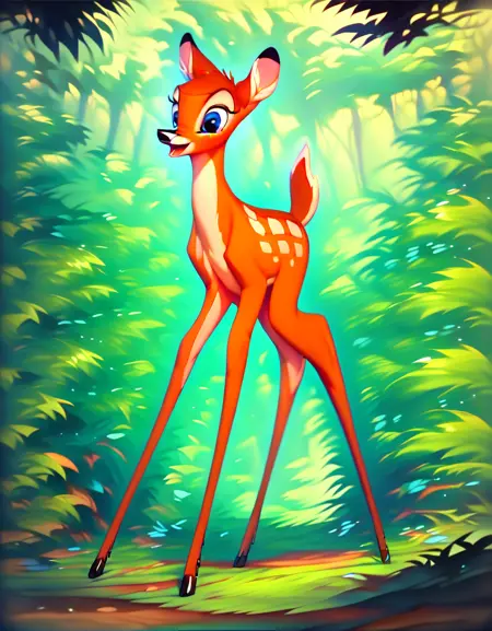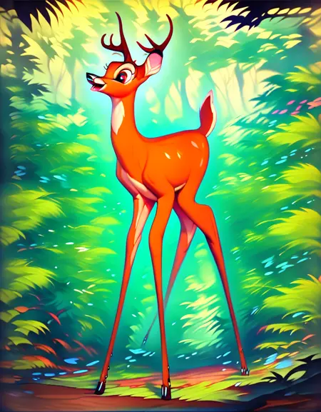 프롬프트: lora:Bambi:1 bambi, deer, masterpiece, children, hyper realistic, full body,
