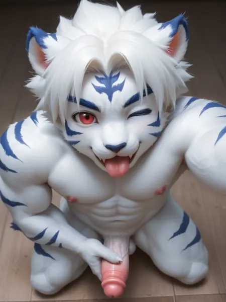 正面关键词:白虎、白色身体、阴阳大战记、红眼睛、蓝多色头发、男孩女孩风
