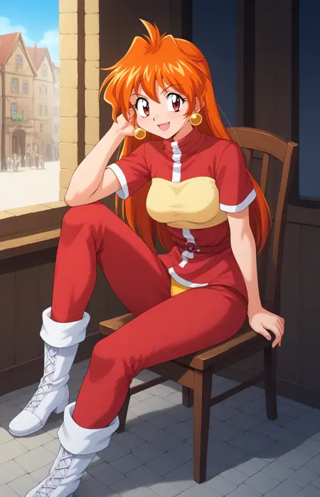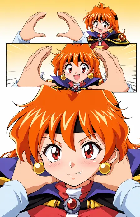 lina inverse, 레트로 아트스타일, 1990년대 (스타일), 1소녀, 주황색 머리카락, 큰 눈, 붉은 눈, 이빨,