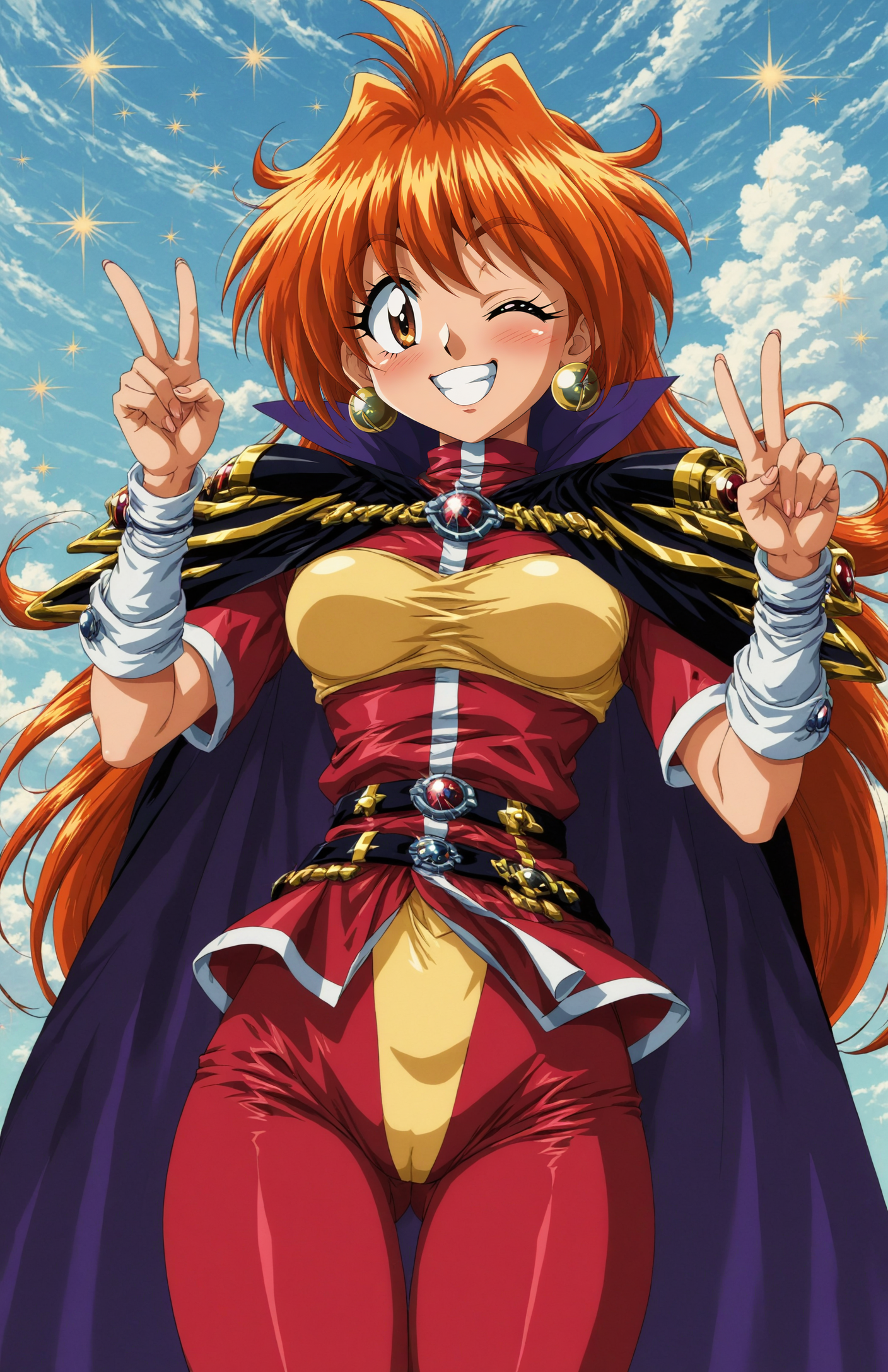 lina inverse, retro artstyle, 1990s (style), 1girl, orange hair, big eyes, red eyes, fang,