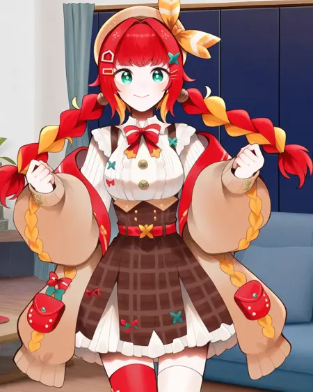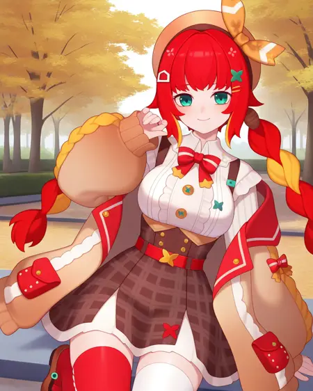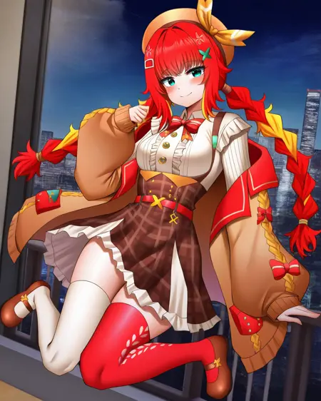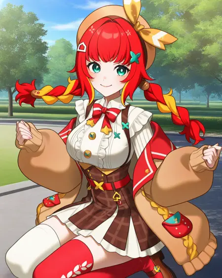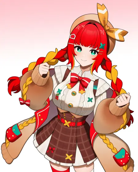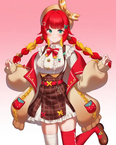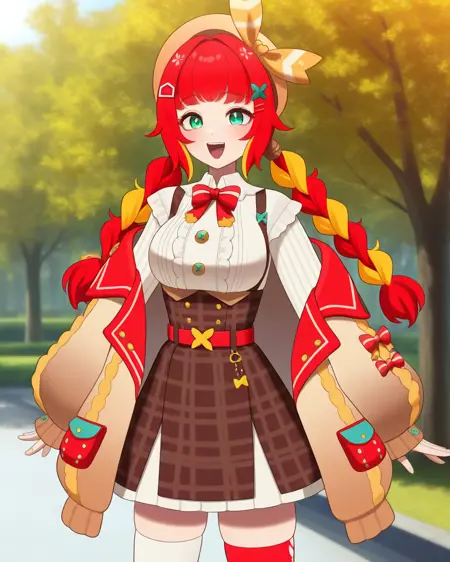 **fumihausuタグを使って彼女を召喚。緑の瞳, 髪リボン, 赤い髪, ブロンドの髪, マルチカラーの髪, 短い髪, ヘアバンド, 髪飾りで頭を構成し、ロングスリーブなし, スカート, ショートスカート, リボン**で彼女の定番衣装を召喚。LoRA重みの推奨値は0.6です。