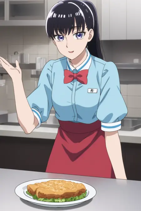 女服务员 - 立花亮,长发,黑发,马尾辫,紫色眼睛,立花女服务员,蓝色衬衫,白色衣领,红色蝴蝶结,短袖,蓬松短袖,黑色裙子,红色围裙,白色过膝袜,乐福鞋