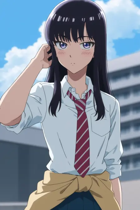 校服(春季)- 立花亮,长发,黑发,紫色眼睛,立花学园,校服,白衬衫,有领衬衫,袖子卷起,红色领带,条纹领带,衣服围在腰间,黄色毛衣围在腰间,百褶裙,蓝色裙子,黑色过膝袜,乐福鞋