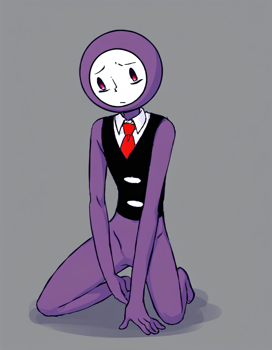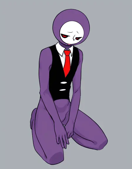 cosm0s, 1boy, solo, purple skin, colored skin, red necktie, black vest, solid circle eyes, two-tone skin