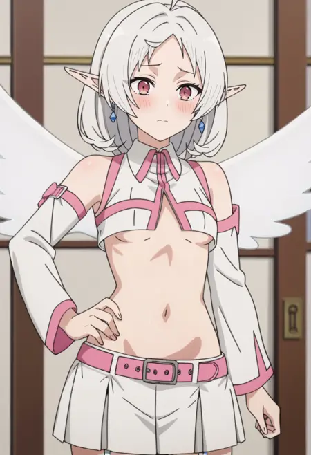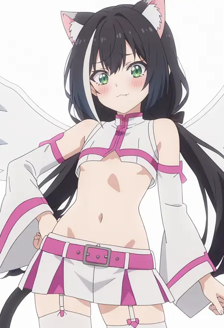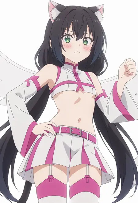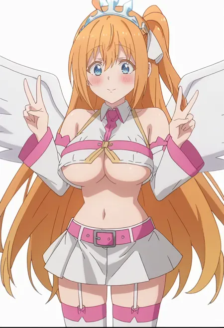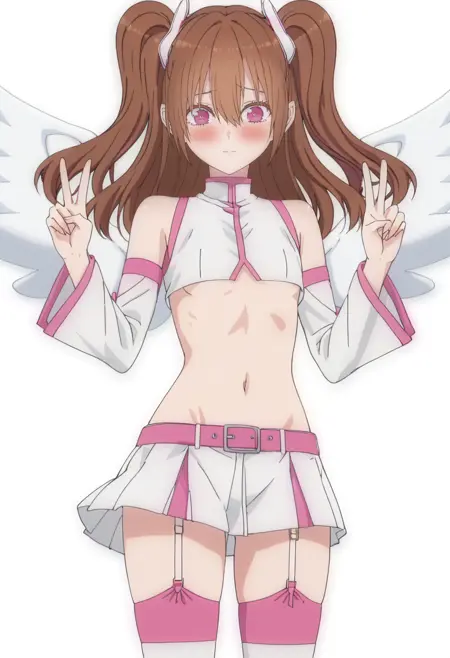 다른 유용한 프롬프트: lilieloutfit1,miniskirt, white thighhighs, long sleeves, detached sleeves, navel, pleated skirt, angel wings, midriff, crop top, underboob, garter straps, white wings, wing hair ornament, pink belt, wings, under boob, belly, garter belt, thighhighs, bare shoulders, no bra,