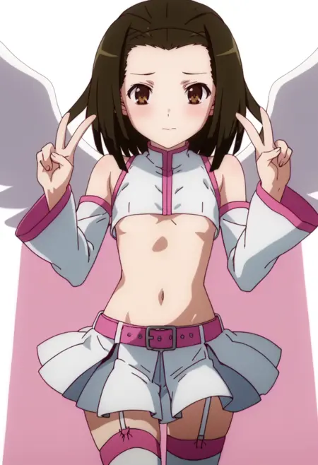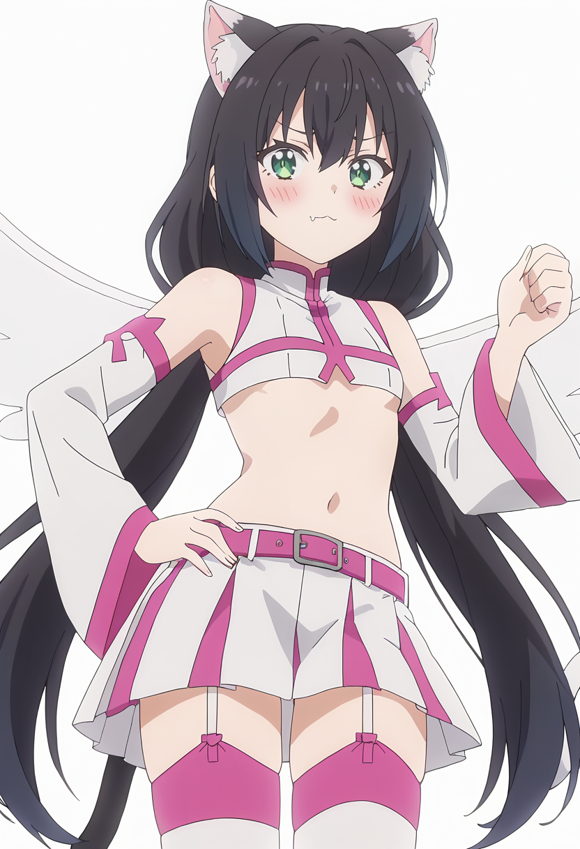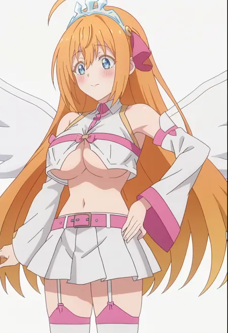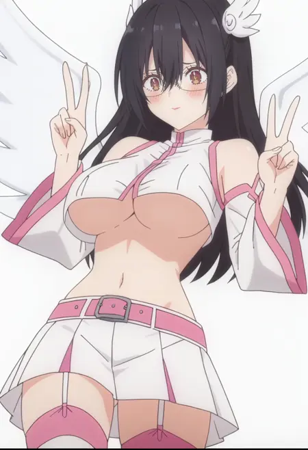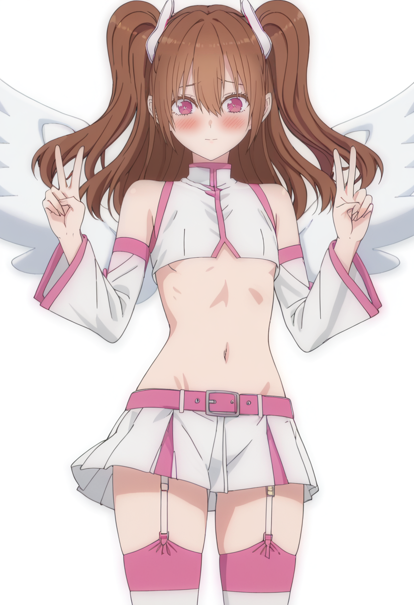 • 其他有用提示: lilieloutfit1,miniskirt, white thighhighs, long sleeves, detached sleeves, navel, pleated skirt, angel wings, midriff, crop top, underboob, garter straps, white wings, wing hair ornament, pink belt, wings, under boob, belly, garter belt, thighhighs, bare shoulders, no bra,