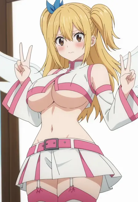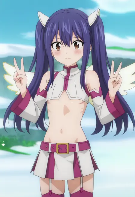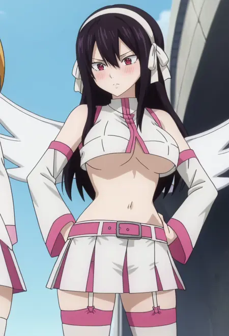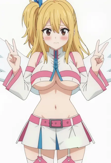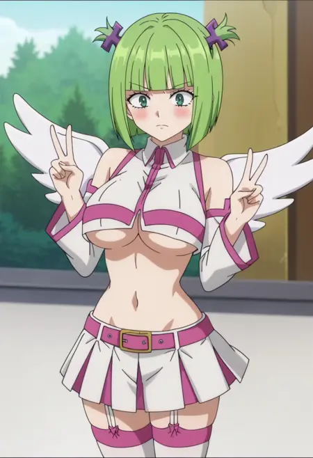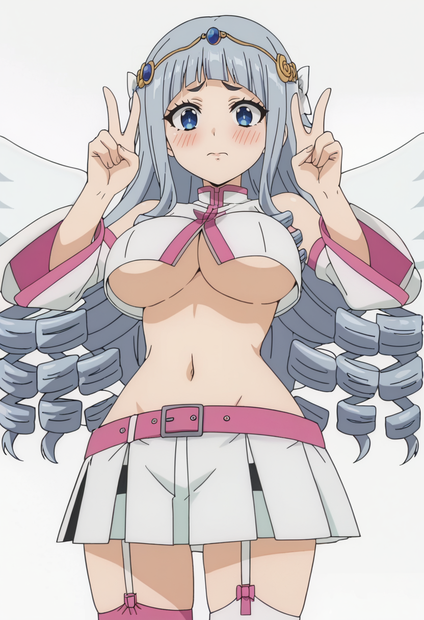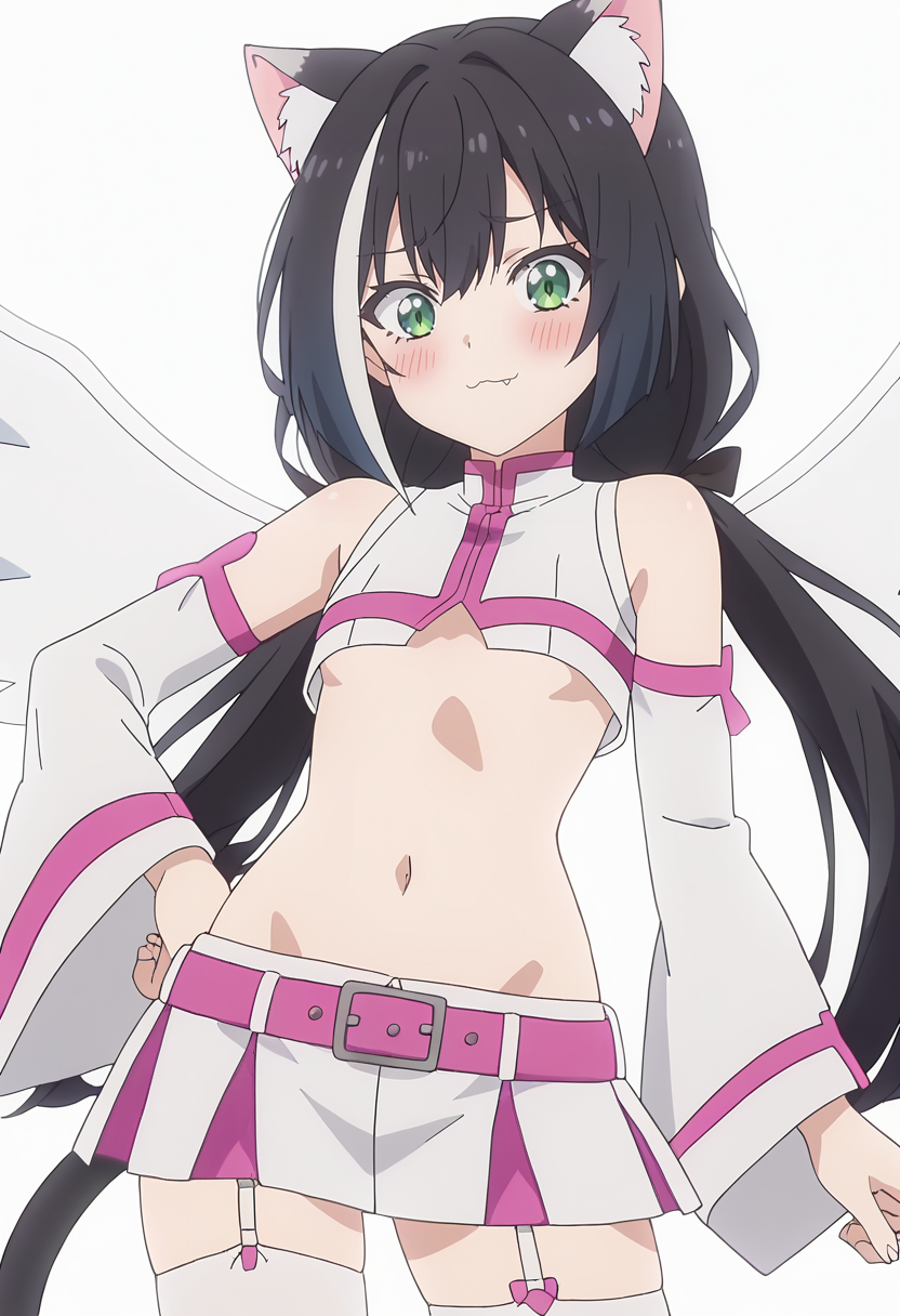 • 其他有用提示: lilieloutfit1,miniskirt, white thighhighs, long sleeves, detached sleeves, navel, pleated skirt, angel wings, midriff, crop top, underboob, garter straps, white wings, wing hair ornament, pink belt, wings, under boob, belly, garter belt, thighhighs, bare shoulders, no bra,