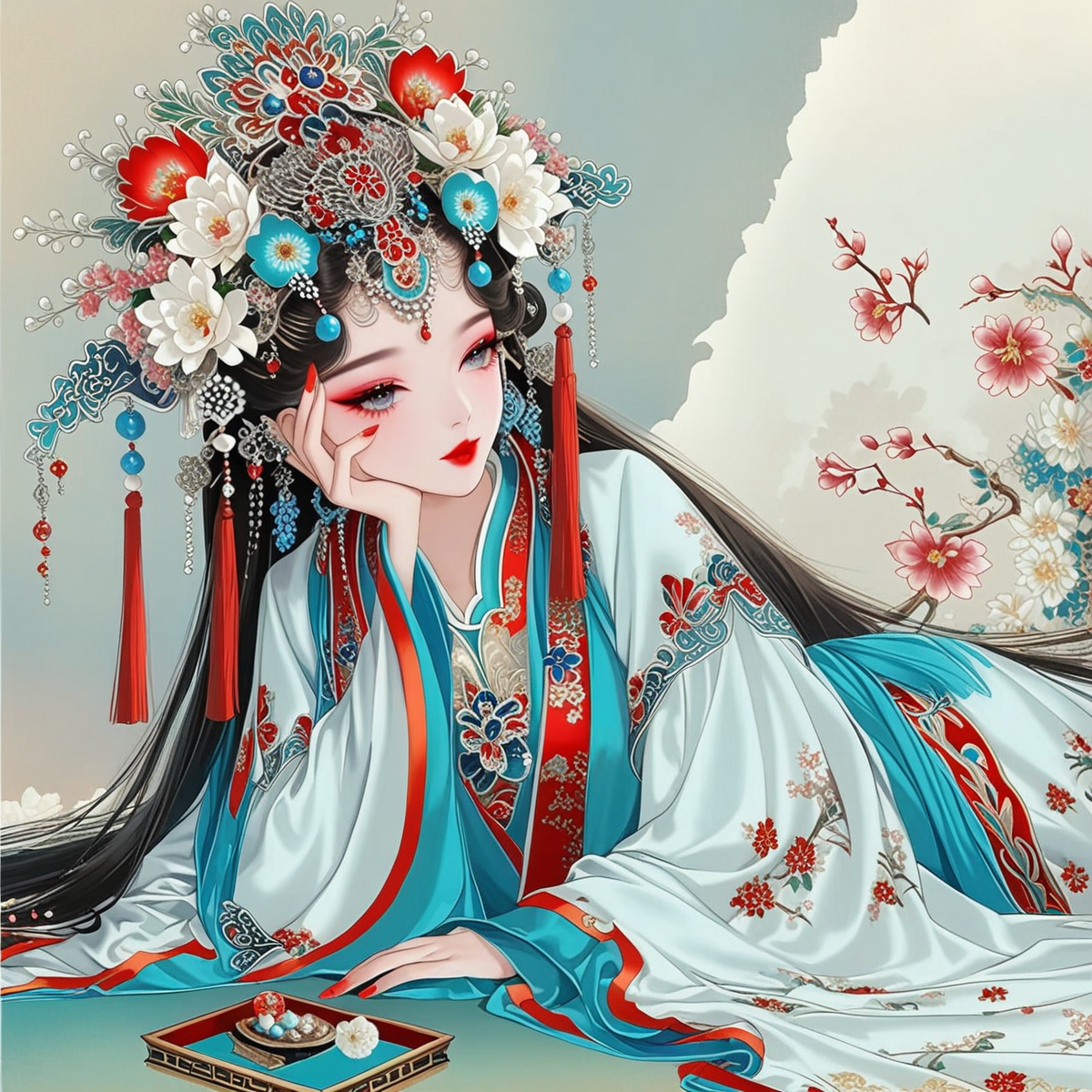 권장 태그: (huadan, makeup, hair ornament, red lips, eyeshadow, nail polish, jewelry, hair flower)