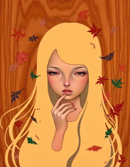 audrey-kawasakiのスタイルで、指と絡み合う流れのような波打つオレンジ色の髪を持ち、遠くを見つめる思索的な目を持つ女性のイラスト。背景には薄いピンク色の中に、頭蓋骨と黒いシルエットの葉陰が囲む。