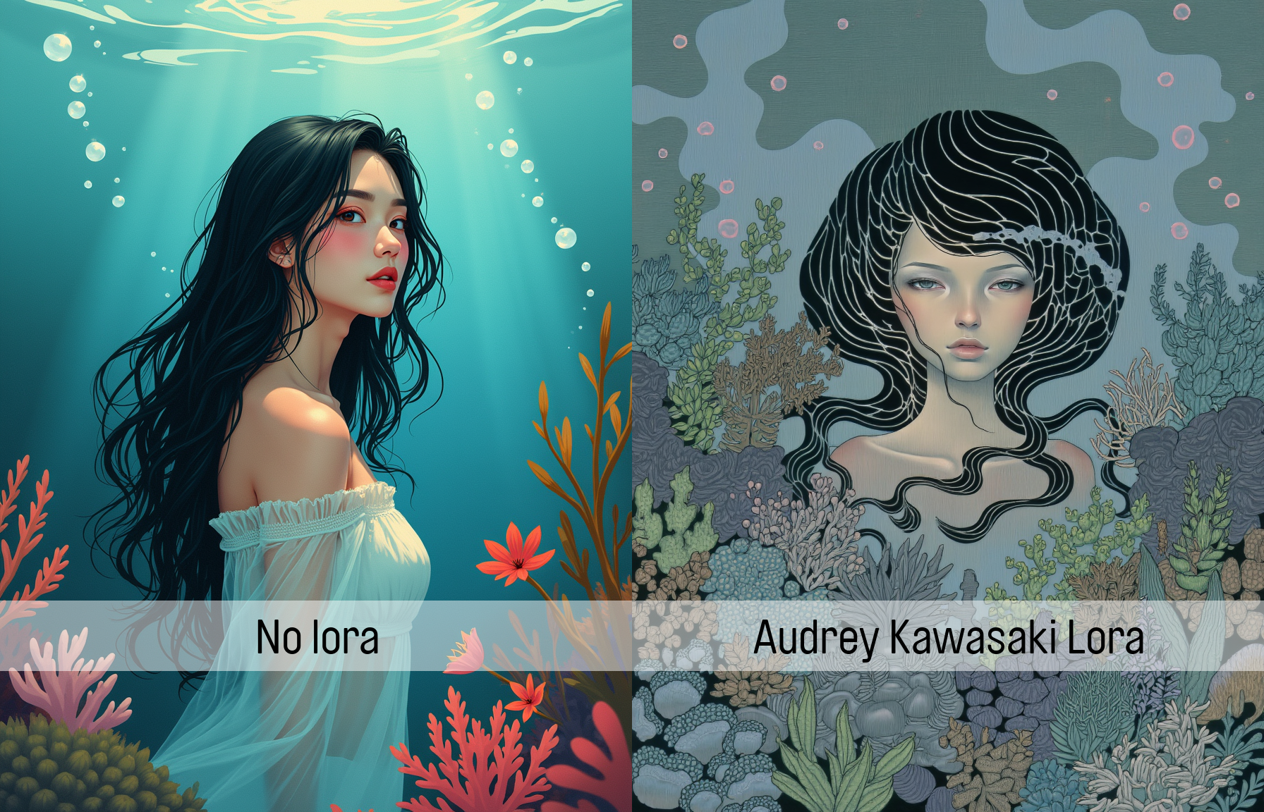 audrey-kawasakiのスタイルで、長い髪と多くの魚を持つ女性の絵画