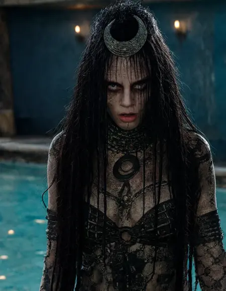 触发词:enchantress_girl,黑色长发,月神头饰,神秘纹身,暗色妆容,部落珠宝,破旧衣物,金属链条,树叶与金属配饰,大地色系,暴露着装,沧桑古老外观