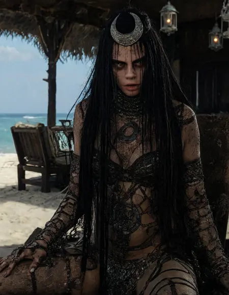 트리거 단어: enchantress_girl, 긴 검은 머리, 달 모양의 머리 장식, 마법적인 문신, 어두운 메이크업, 부족 문양의 보석, 찢어진 옷, 금속 사슬, 잎과 금속 액세서리, 흙색 톤, 드러나는 옷차림, 낡고 고대적인 외관