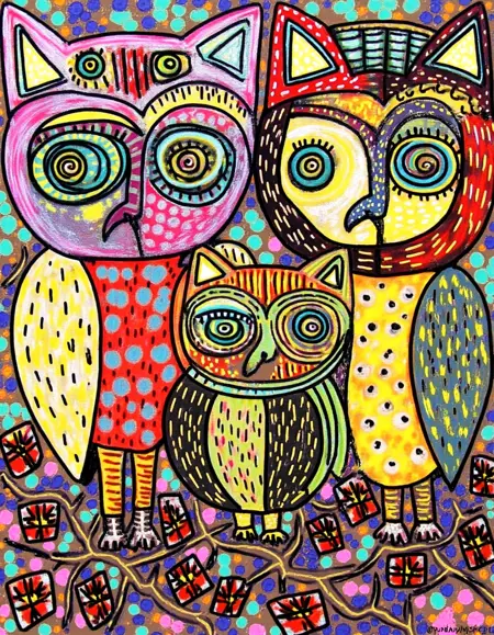 • 2羽のフクロウを伴う人物をサンドラ・シルバツヴァイクのスタイルで描いた絵