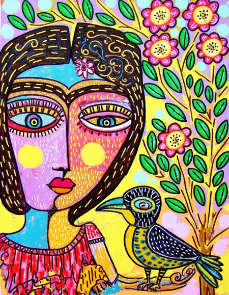 • 女性と鳥をサンドラ・シルバツヴァイクのスタイルで描いた絵