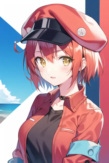 outfit:<빨간 재킷, 검은 속옷, 청바지 반바지, 검은 양말, 빨간 부츠, 캐비 헤드)>