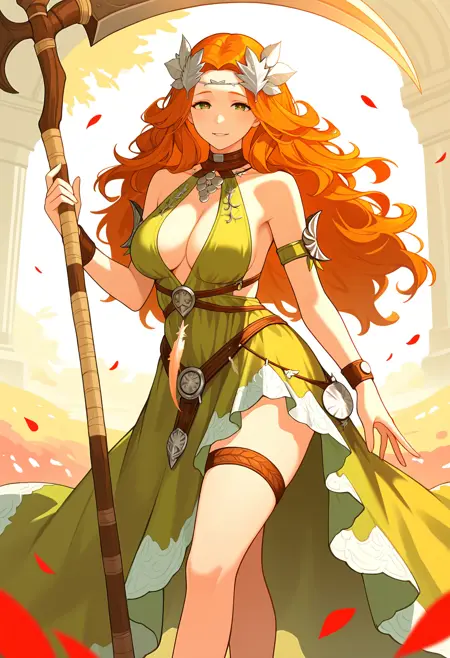 의상: ["nophicadwnsty, green eyes, orange hair, wavy hair, laurel crown, hair ornament, green dress, sleeveless dress, circlet, armlet, feathers, bracelet, necklace,cleavage, sideboob, breasts apart,"]