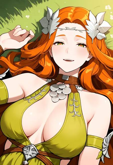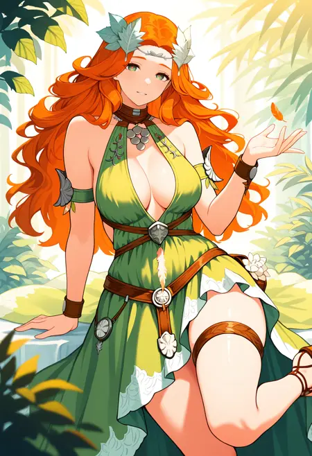 의상: ["nophicadwnsty, 녹색 눈, 주황색 머리, 물결치는 머리, 월계관, 머리 장식, 녹색 드레스, 소매 없는 드레스, 원형 머리장식, 팔찌, 깃털, 팔찌, 목걸이, 가슴 노출, 측면 가슴, 가슴 사이 간격,"]
