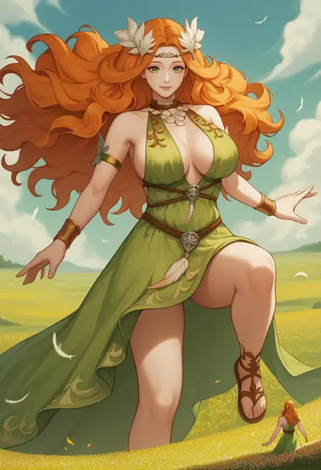 衣装: ["nophicadwnsty, green eyes, orange hair, wavy hair, laurel crown, hair ornament, green dress, sleeveless dress, circlet, armlet, feathers, bracelet, necklace,cleavage, sideboob, breasts apart,"]