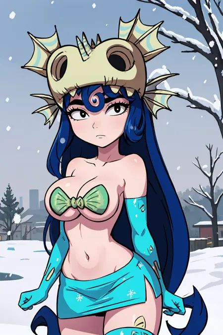 Basic prompts : 1girl, annettaf, absurdly long hair, blue hair, black eyes, no pupils, makeup