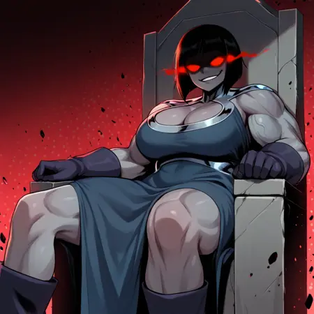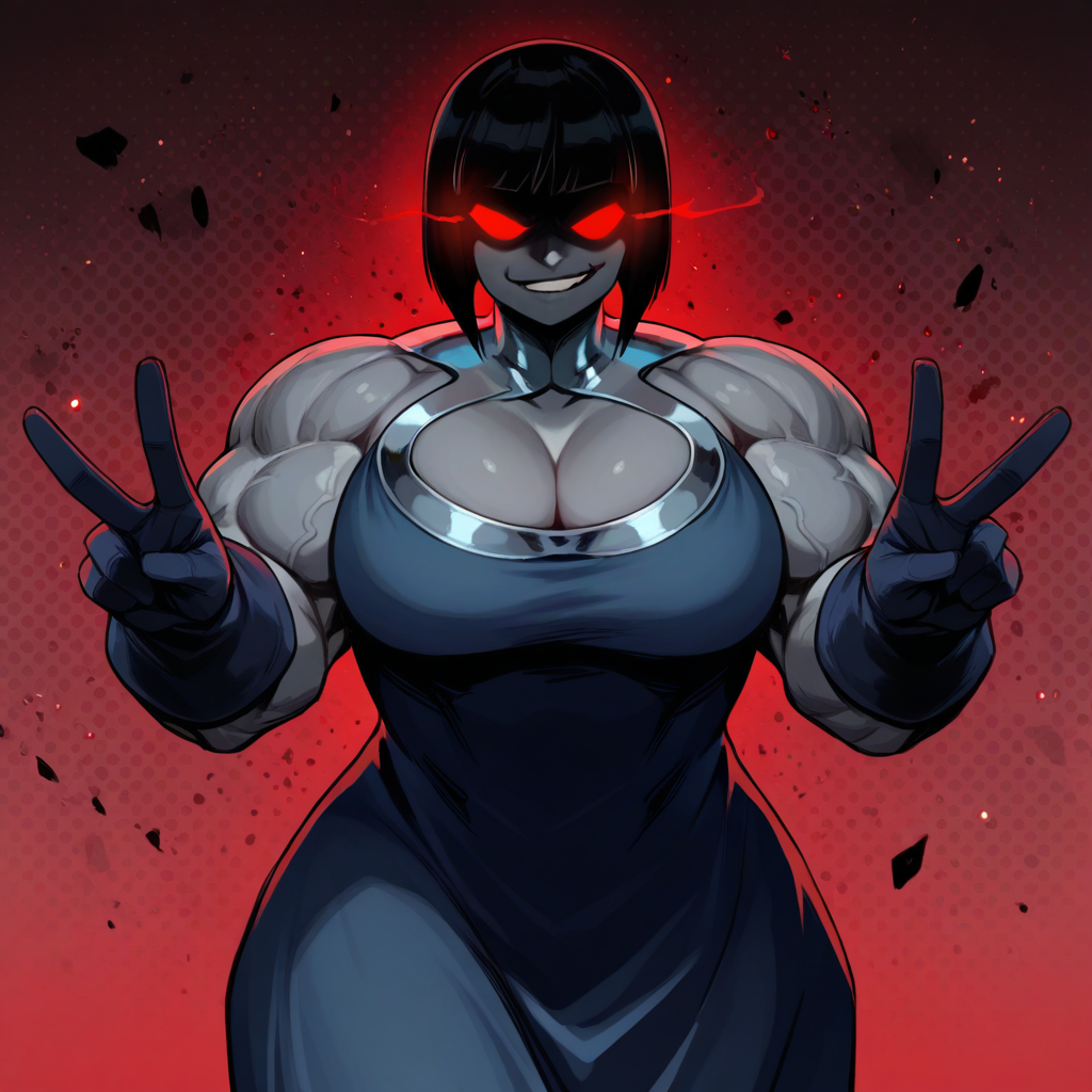 LadyDarkseid, 1girl, solo, black hair, short hair, no pupils, red sclera, red glowing eyes, muscular,