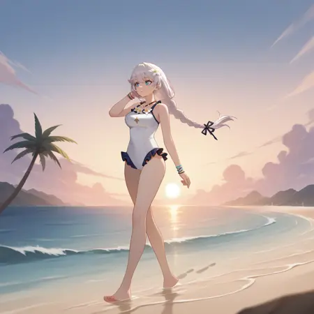 KalKas, Fol003, Kk_Swm, white hair, long hair, braided ponytail, blue eyes, white swimsuit, white one-piece swimsuit, flower necklace, hair flower, frilled swimsuit, white flower, bracelets,
