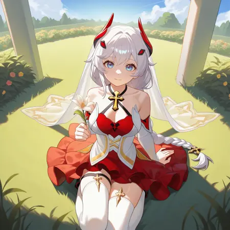 KalKas, Fol003, Kk_Hym, white hair, long hair, braided ponytail, blue eyes, frilled dress, sleeveless dress, halterneck, red dress, alt corset, white corset, criss-cross halter, alternate jewelry, cleavage, alt detached sleeves, white long sleeves, red bra, alternate white thighhighs, bridal veil, hair ornament, gold cross, thigh strap, criss-cross straps, bare shoulders,