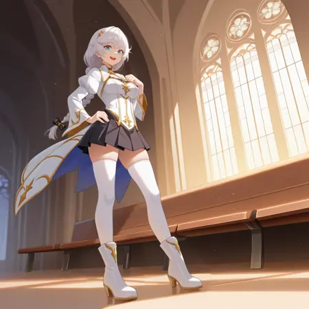 KalKas, Fol003, Kk_Bss, white hair, long hair, braided ponytail, nun outfit, highleg leotard, alt black leotard, nun, veil, nun veil, black pelvic curtain, alternate gloves, white gloves, alt thigh boots, black footwear, arm belt, white collar, thigh belt, multiple belts, alternate long sleeves, black wide sleeves,