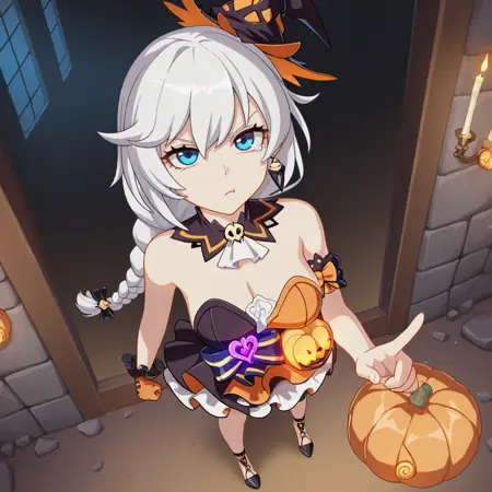 KalKas, Fol002, Kk_Pmp, white hair, long hair, braided ponytail, jack-o'-lantern, blue eyes, halloween costume, strapless dress, bubble skirt, two-tone dress, orange dress, black dress, witch hat, detached collar, white ascot, frilled skirt, layered skirt, alt jewelry, cleavage, purple heart (symbol), pumpkin, single bracelet, orange single glove, single frilled wrist cuff, earrings, leg ornament, black high heels