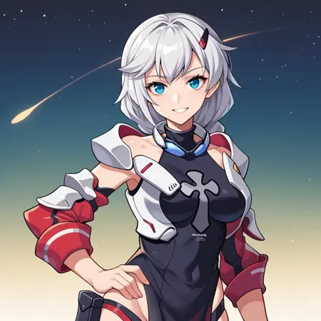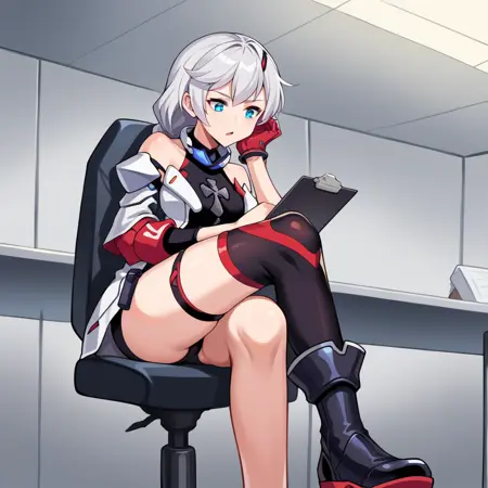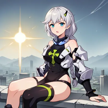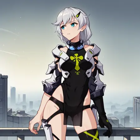 KalKas, Fol001, Kk_Def, 白发, 长发, 编织马尾, 蓝眼, 黑色紧身衣, 装甲紧身衣, 无袖高领紧身衣, 白色装甲, 红色镶边, 黑色内裤, 黑色过膝袜, 单侧过膝袜, 装甲袖子, 十字图案, 灰色十字, 黑色袖子, 红色袖口, 发夹, 围绕颈部的护目镜, 大腿枪套, 不匹配的手套, 黑色单指露指手套, 红色单只手套, 透明材质, 裸露肩膀, 透明骨盆帘, 短骨盆帘, 黑色装甲靴,