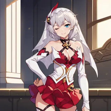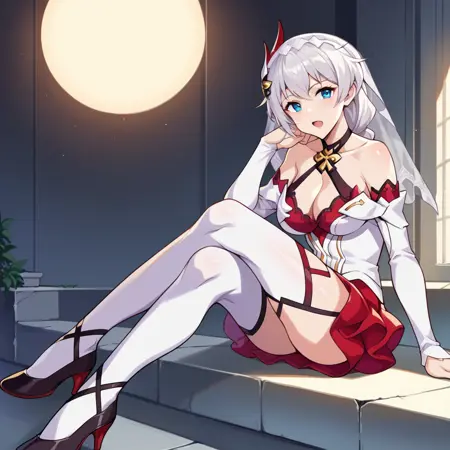 KalKas, Fol003, Kk_Hym, 白发, 长发, 编织马尾, 蓝眼, 荷叶边连衣裙, 无袖连衣裙, 吊颈式, 红色连衣裙, 替代胸衣, 白色胸衣, 交叉吊颈, 替代饰品, 暴露胸部, 替代分离袖子, 白色长袖, 红色文胸, 替代白色过膝袜, 婚纱面纱, 头饰, 金色十字架, 大腿带, 交叉绑带, 裸露肩膀,