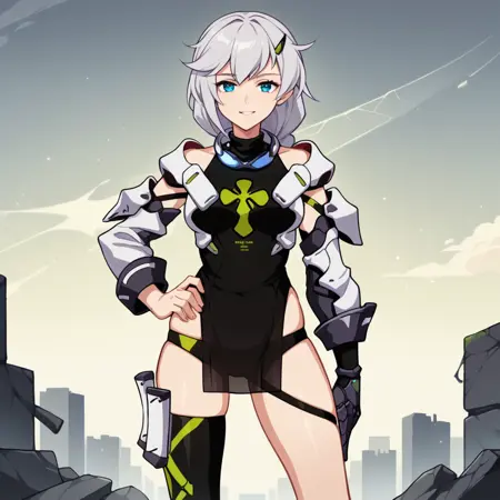Kas_Alt, 黑色紧身衣, 白色装甲, 黑色内裤, 黑色过膝袜, 单侧过膝袜, 分离袖子, 裸露肩膀, 骨盆帘, 围绕颈部的护目镜, 发夹, 高领, 十字图案, 绿色十字, 黑色腕 cuff, 黑色袖子, 绿色镶边, 黑色手套, 单只手套, 大腿带, 大腿袋,
