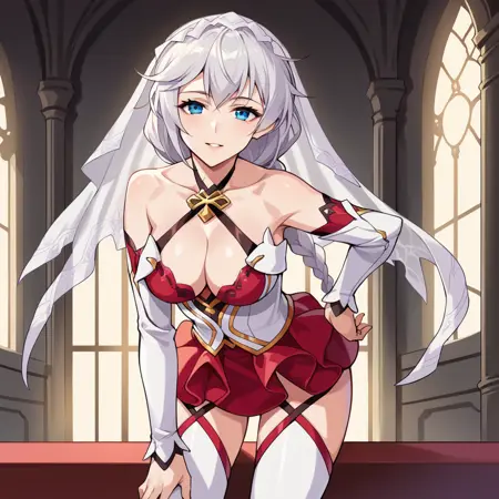 KalKas, Fol003, Kk_Hym, white hair, long hair, braided ponytail, blue eyes, frilled dress, sleeveless dress, halterneck, red dress, alt corset, white corset, criss-cross halter, alternate jewelry, cleavage, alt detached sleeves, white long sleeves, red bra, alternate white thighhighs, bridal veil, hair ornament, gold cross, thigh strap, criss-cross straps, bare shoulders,