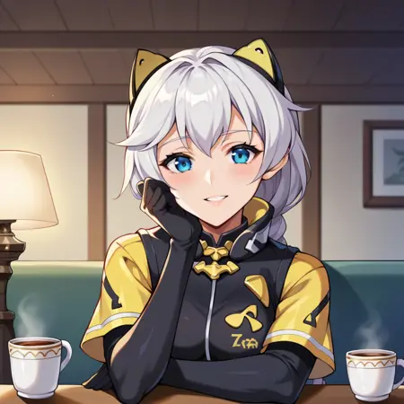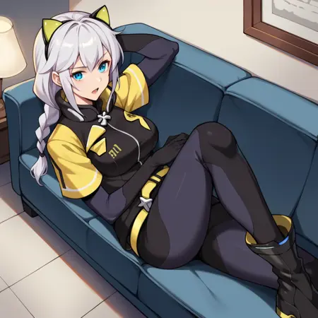 KalKas, Fol001, Kk_Swf, white hair, long hair, braided ponytail, blue eyes, cat ears, yellow belt, loose belt, black jacket, jacket, high collar, yellow trim, yellow short sleeves, black long gloves, bodysuit, jewelry, clothing writing, leggings, black ankle boots