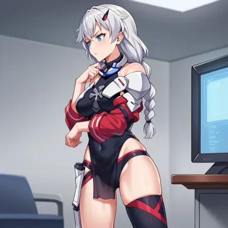 KalKas, Fol001, Kk_Def, white hair, long hair, braided ponytail, blue eyes, black leotard, armored leotard, sleeveless turtleneck leotard, white armor, red trim, black panties, black thighhighs, single thighhigh, armored sleeves, cross print, grey cross, black sleeves, red sleeve cuffs, hairclip, goggles around neck, thigh holster, mismatched gloves, black single fingerless glove, red single glove, see-through, bare shoulders, see-through pelvic curtain, short pelvic curtain, black armored boots,