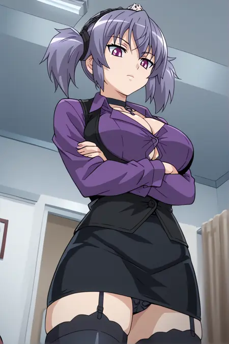 髪飾り、紫髪、短いツインテール、ピンクの目、大きな胸衣装