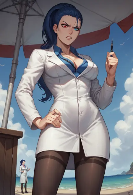 白いラボコート、青いシャツ、黒のパンティーハイズ、黒い靴、黒い鉛筆スカート