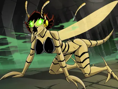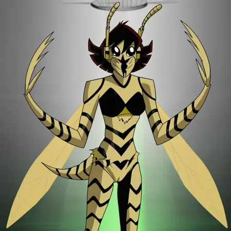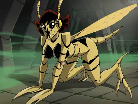 mandibles, mutant, claws, wasp, skin, insect, clawed, hair, antennae,image of gamma mutant wasp,mutant wasp,Earth's Mightiest Heroes,medium breasts,black stripes,large yellow translucent insect wings,long claws