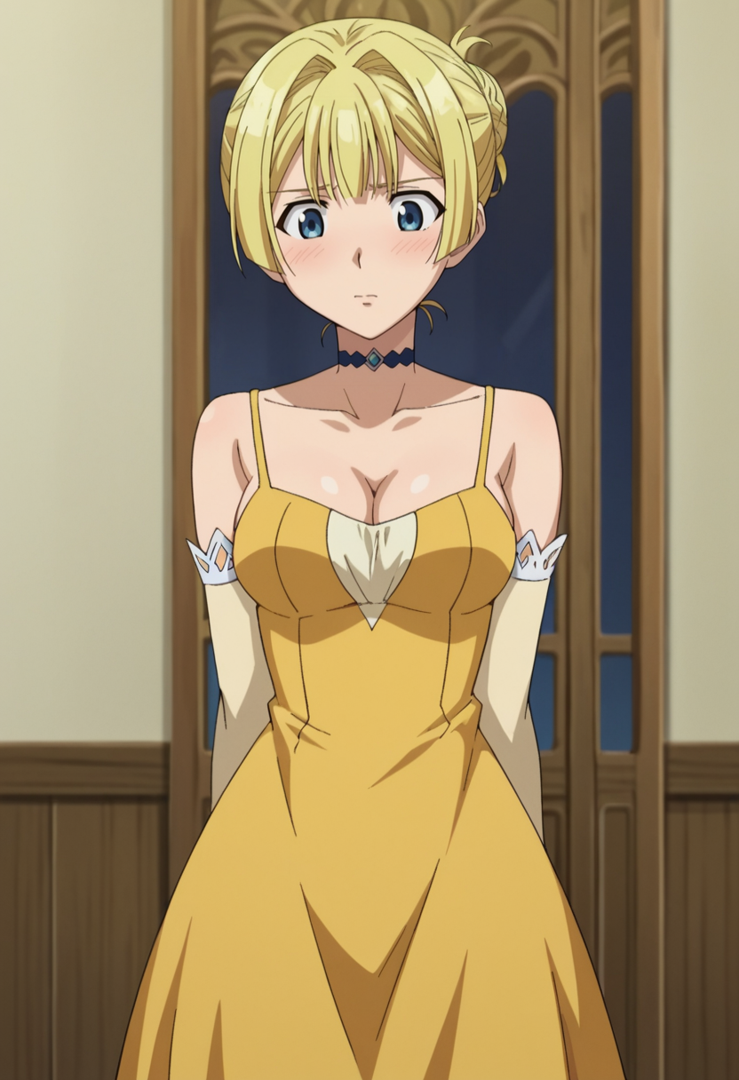 hair bun,single hair bun ,dress,yellow dress,cleavage,gloves,choker,elbow gloves,