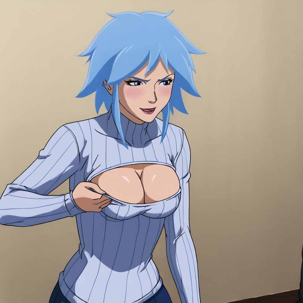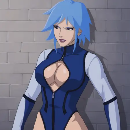 トリガー:killerfrost, 1girl, 青いレオタード, 肘まである手袋, 青い髪, 胸, 肩出し, 短髪