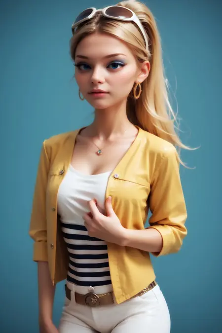 服装触发词:sunglasses on head, jewelry, necklace, striped shirt, yellow jacket, capri pants, white pants, belt