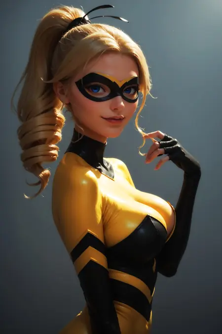 트리거: imtdqubee, blonde hair, mask, domino mask, yellow bodysuit, blue eyes, ponytail, long hair, superhero, fingerless gloves, elbow gloves, drill hair, skin tight.