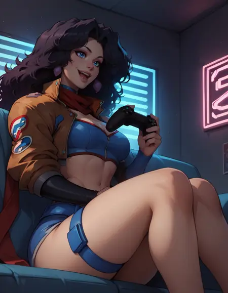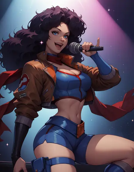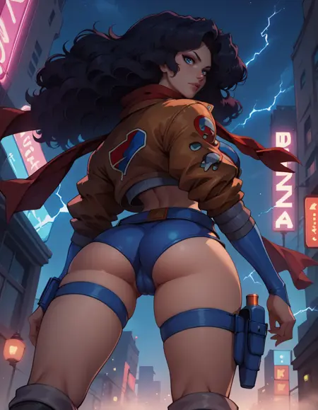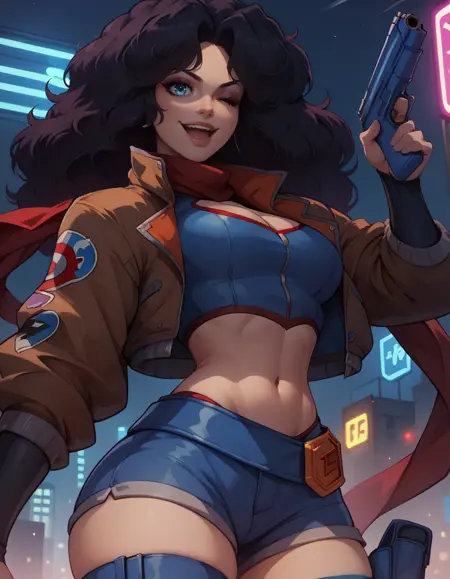 shorts, crop top, jacket, knee boots, thigh strap, red scarf, holster, choker, belt, elbow gloves,