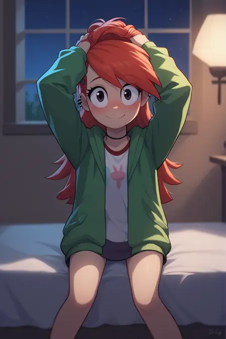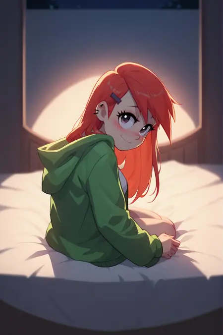 그녀의 전형적인 옷차림을 얻고 싶다면, "녹색 후드티, 보라색 스커트, 말리 머리, 목걸이, 은은한 배꼽 노출"을 추가해 보세요.