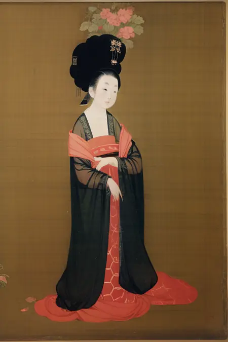 The material comes from the "Picture of Ladies in the Tang Palace" and "Picture of Ladies with Hairpins" by Zhang Xuan and Zhou Fang in the Tang Dynasty, intending to use AI to continue to write the beauty of the ladies in the Tang Palace.