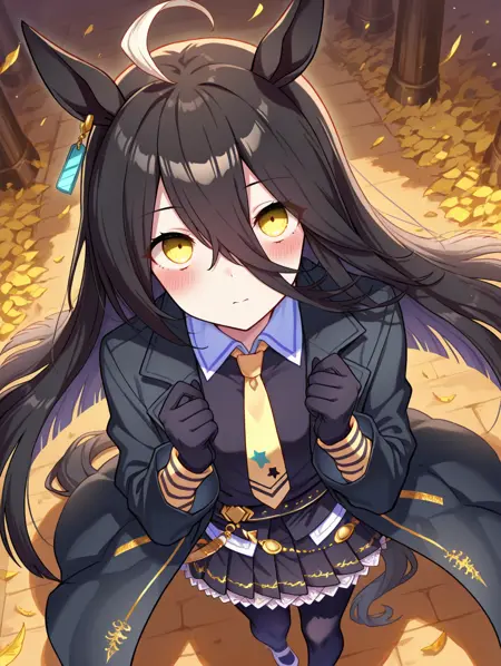 ahoge, animal ears, black gloves, black hair, black jacket, black skirt,