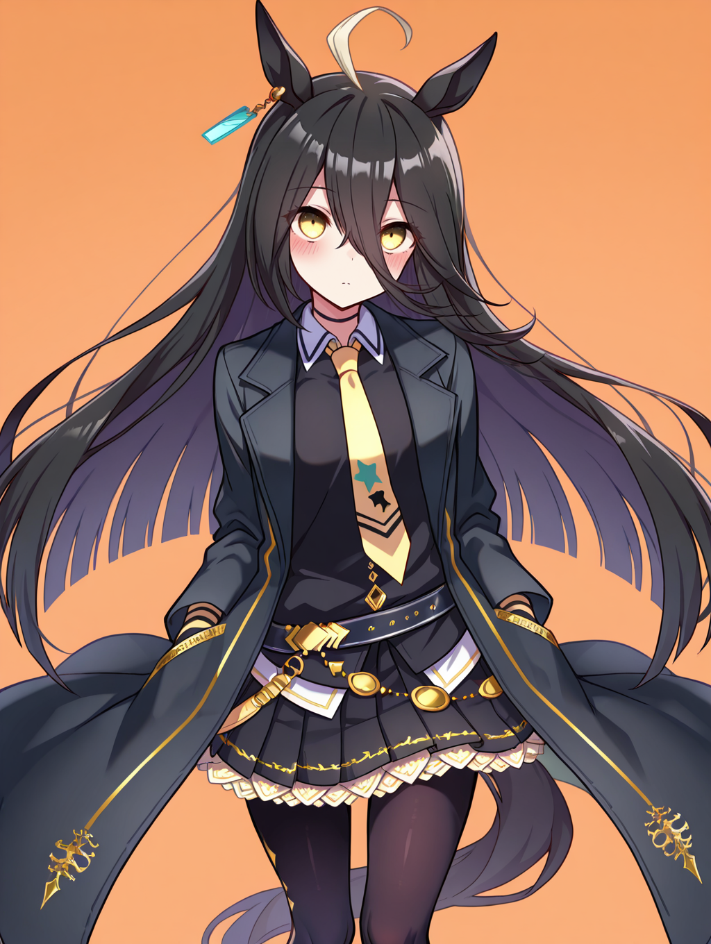 single earring, skirt, yellow eyes, black coat, black pantyhose, black shirt,