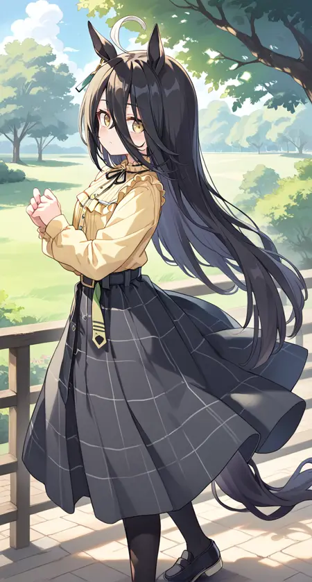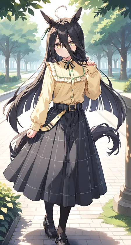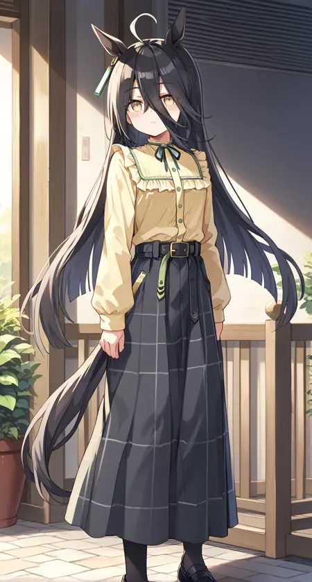 horse tail,pantyhose,tail,black belt,casual,long skirt,