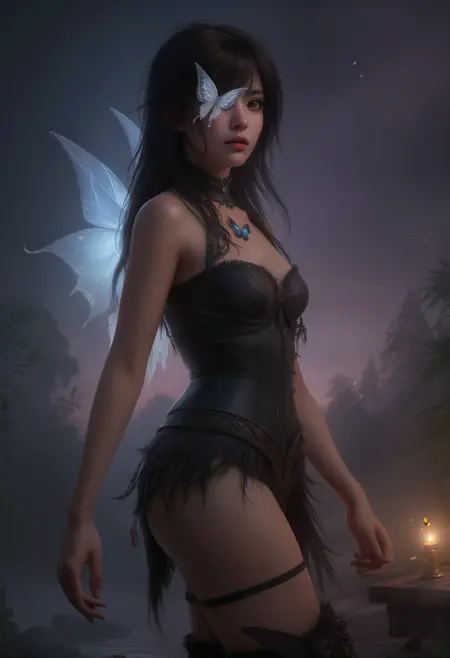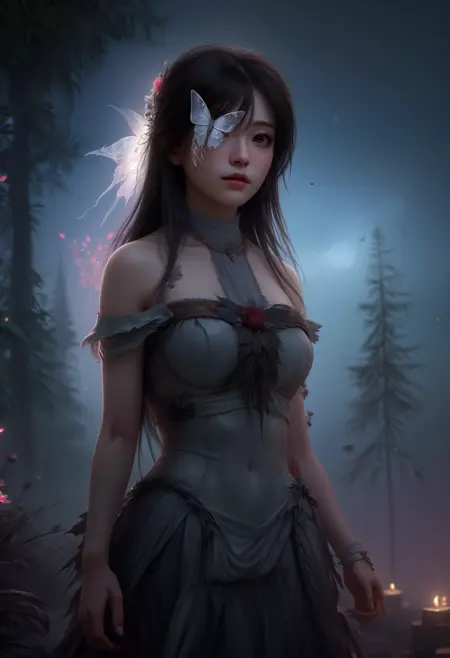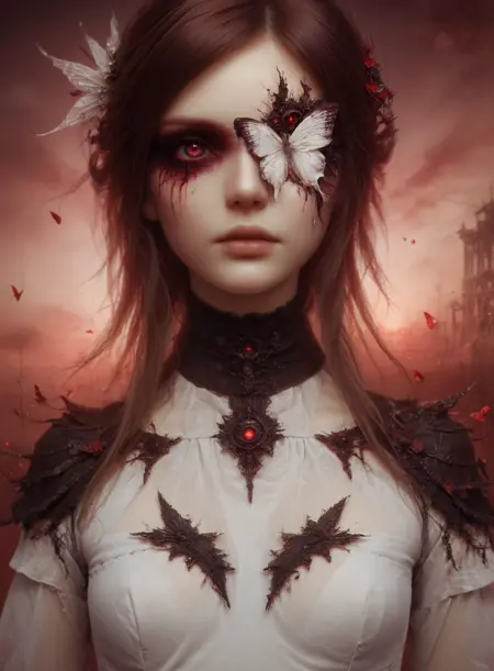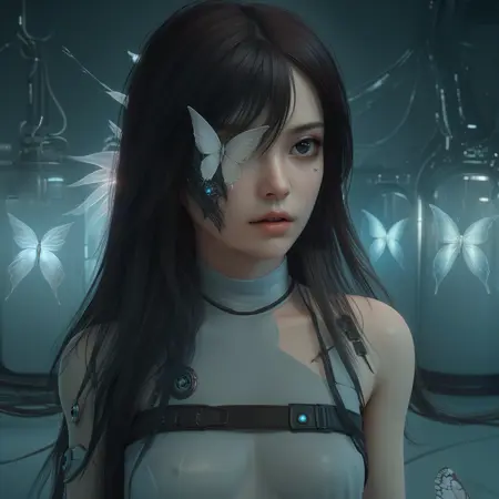 Mitsuko 초상화: 얼굴의 나비 변이와 흐르는 듯한 드레스를 담아, 그녀의 초현실적 아름다움과 독특한 스타일을 포착한 멋진 초상화를 생성합니다.