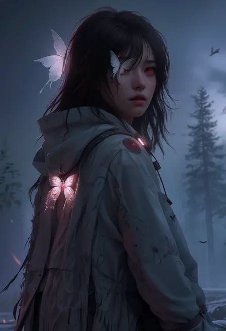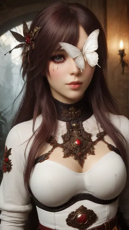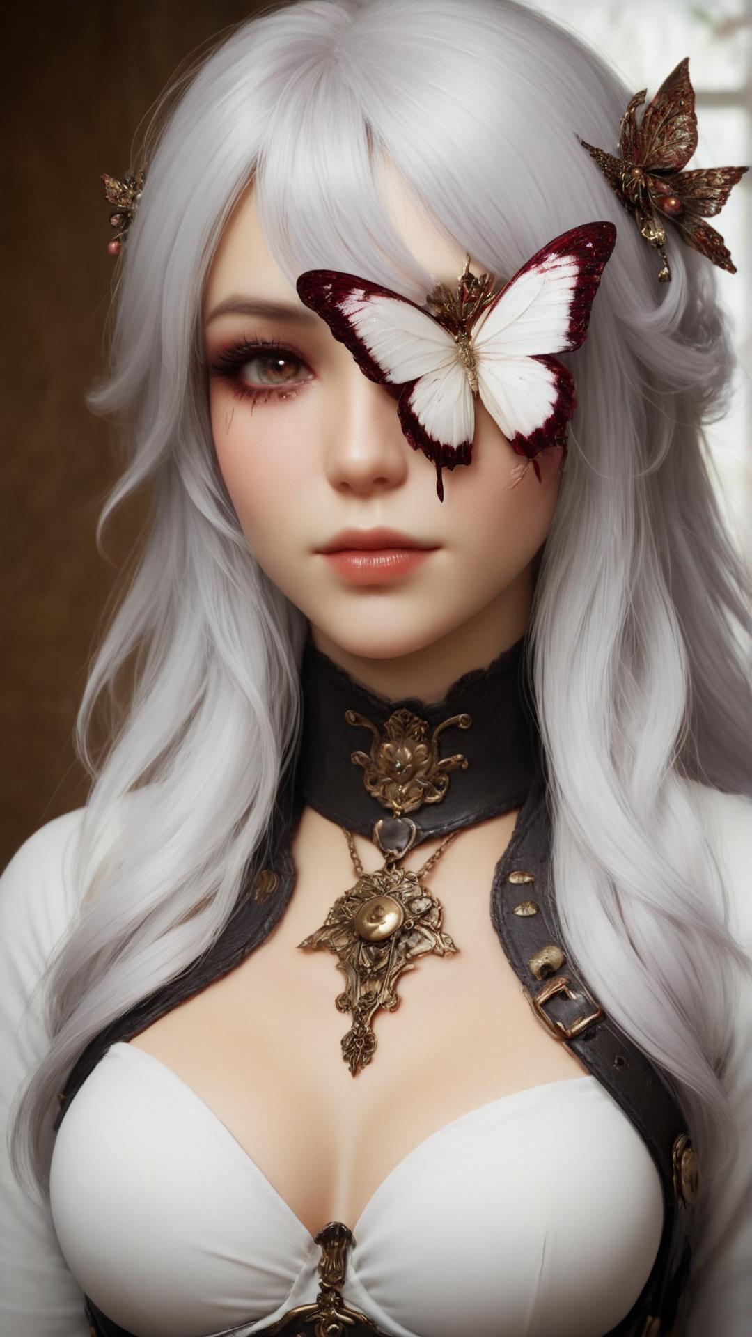 Mitsuko-OnceHuman, white butterfly in right eye,