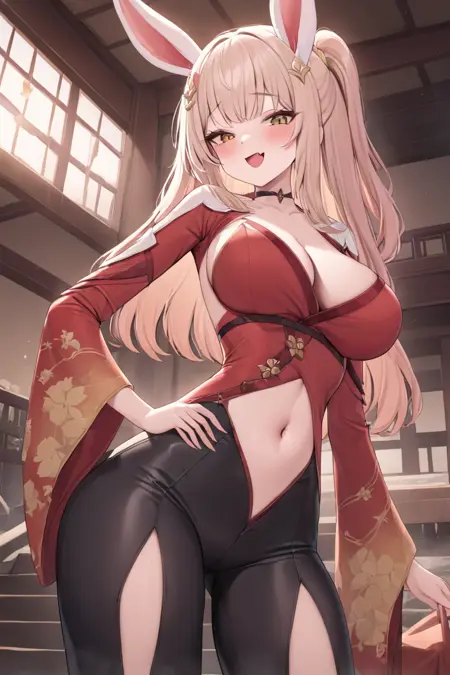 , navel, long sleeves, rabbit tail, red dress, black pants, cleavage, clothing cutout, choker, wide sleeves, hair ornament, <lora:Gongsunli_xl:0.8>